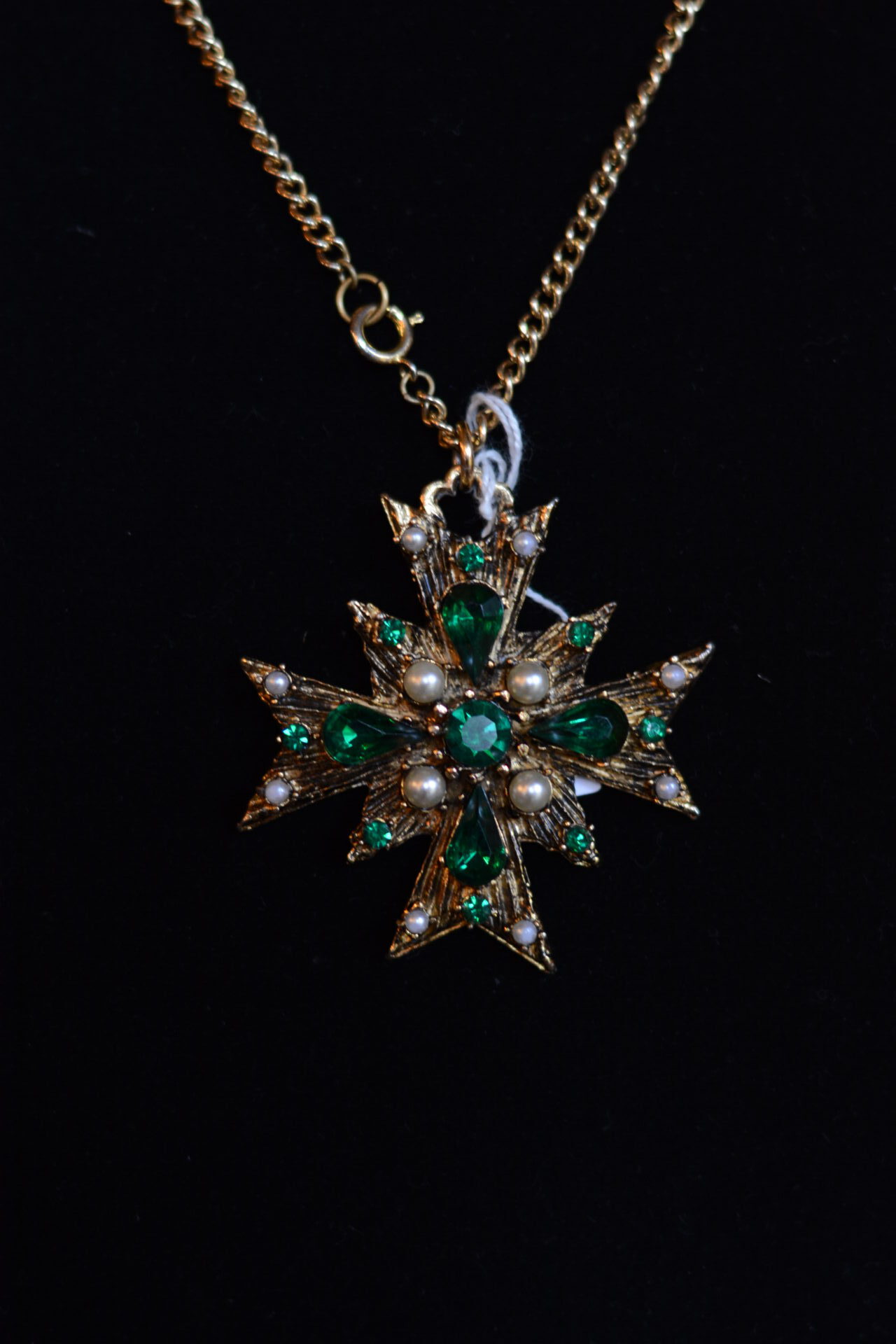pre-loved necklace with faux pearls and deepgreen nice cut glass stones